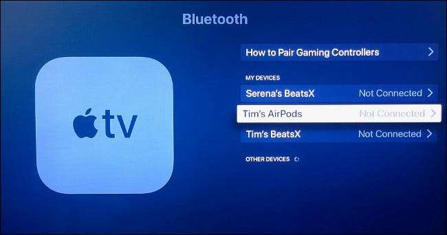 Тепер ви повинні побачити ваші AirPods з'являються в розділі «Інші пристрої» заголовок в списку з'єднань Bluetooth на екрані. Виберіть це, потім виберіть «Connect» на пару вашої AirPods. Якщо все йде добре, ваші AirPods тепер в парі з Apple TV і аудіо маршрут буде в навушниках, а не динаміки телевізора або приймача.