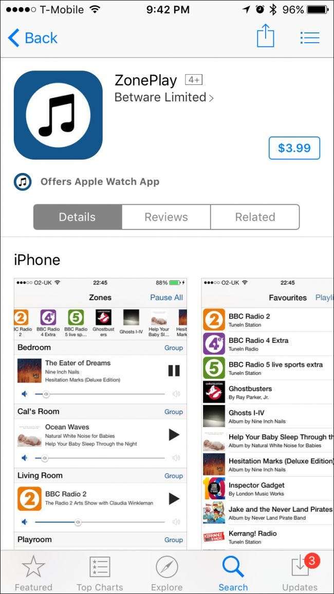 Що стосується Apple Watch, то вам доведеться шукати деінде, щоб приєднатися до партії Sonos. ZonePlay - це неофіційна програма Sonos, яка працює на ваших iPhone, iPad та Apple Watch. За 3,99 доларів це насправді непогано, і можливість керувати програвачем Sonos із зап’ястя цілком варта ціни.