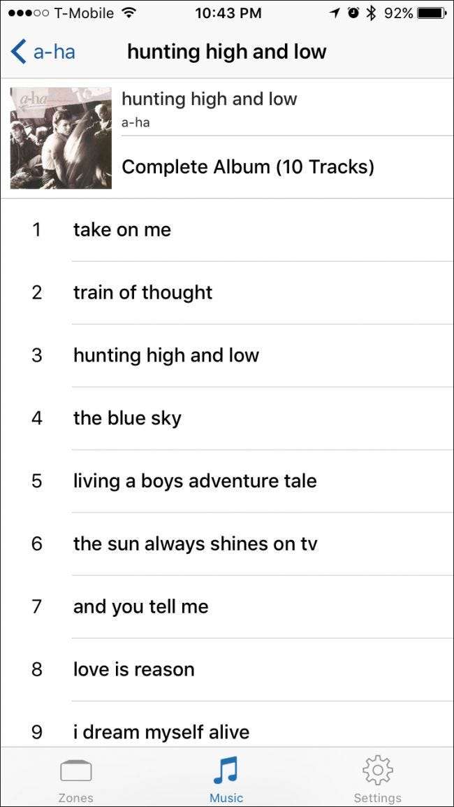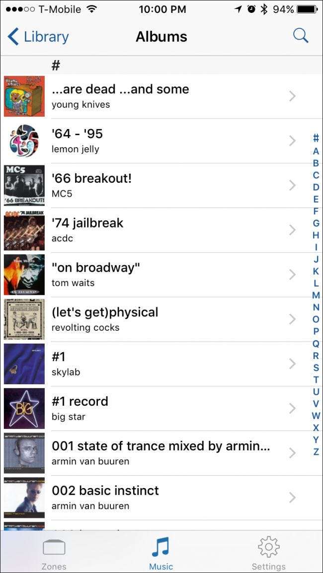 Якщо натиснути кнопку “Музика” внизу програми, ви можете переключатися між вибраним, списками відтворення, бібліотекою (видно нижче в режимі альбомів) та TuneIn Radio.