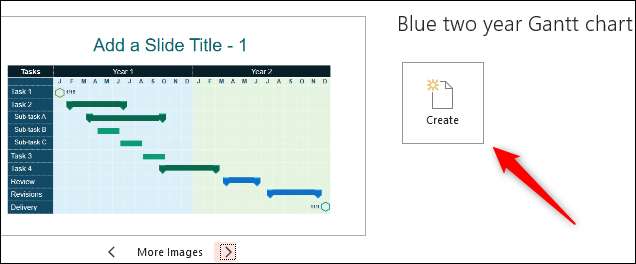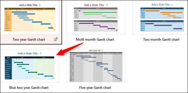 П'ять діаграми Gantt шаблони з'являться в результатах пошуку. Виберіть діаграму Gantt, яка найбільш тісно вирівнюється з графікою проекту, натиснувши його. У цьому прикладі ми будемо використовувати "синю дворічну діаграму Gantt".