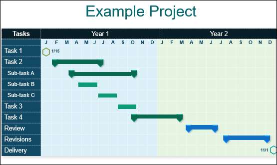 Іконки у верхньому лівому та нижньому праві кути діаграми Gant представляють (1) статтю Kickoff і (2) дату випуску проекту. Ви можете відредагувати дати, натиснувши дати та вводячи дату Kickoff Project, відповідно.