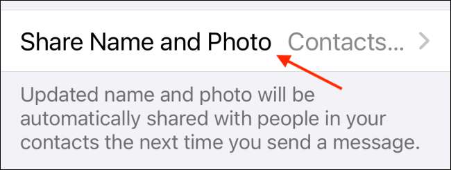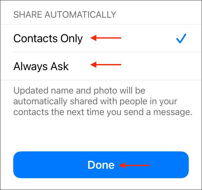 "Завжди запитуйте", вимагає повідомлення про повідомлення, щоб попросити вас, якщо ви хочете поділитися своїм ім'ям та фотографією з людиною, з якою ви маєте розмову. "Контакти" Тільки "автоматично поділяє оновлену назву та фотографію з людьми у ваших контактах APPLE. Виберіть вибір і натисніть кнопку "Готово".