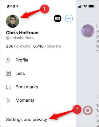 Спочатку відкрийте програму Twitter на своєму телефоні. Торкніться свого профілю, а потім - "Налаштування та конфіденційність".