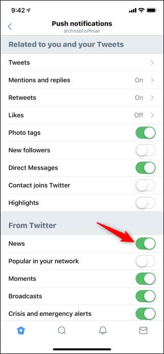 Ви також можете налаштувати типи сповіщень, які Twitter відображатиме вам звідси. Наприклад, можливо, ви захочете відключити повзунки «Основні моменти», «Моменти» та «Популярне у вашій мережі», які можуть відображати новини, про які говорять люди.