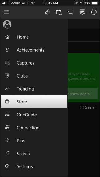 Завантажте програму та ввійдіть за допомогою того самого облікового запису Microsoft, з яким ви входите у свій Xbox One. Торкніться кнопки меню у верхньому лівому куті та натисніть "Store", щоб переглянути магазин Xbox.