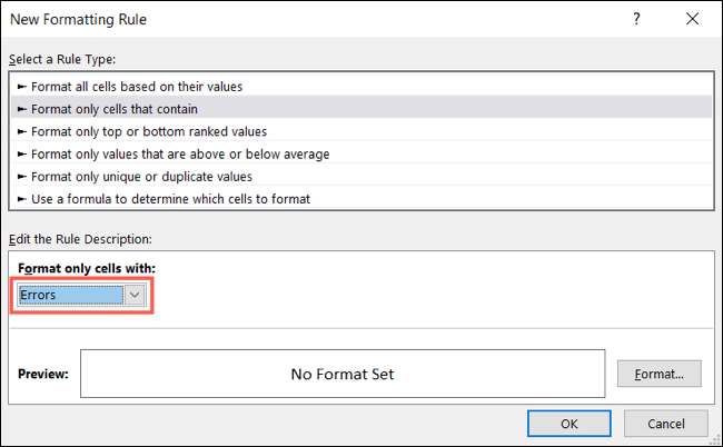 У вікні нового формату форматування виберіть "Формат лише клітин, що містять" у верхній частині. Але цього разу виберіть "Помилки" у форматі лише клітинами з випадаючою коробкою внизу.
