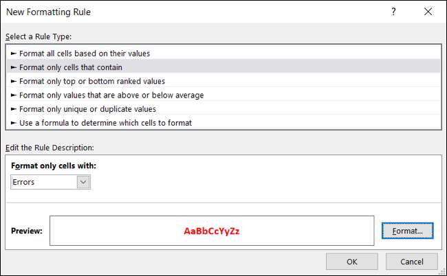 Потім натисніть "Формат", щоб вибрати форматування. Для цього прикладу налаштуйте параметри шрифту, щоб клітини з помилками сміливими та червоними. Натисніть "OK" після того, як ви виберете форматування та "OK" ще раз, щоб застосувати правило.