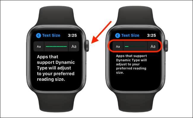 Ви побачите слайдер розміру тексту у верхній частині. Поверніть цифрову корону, щоб збільшити або зменшити розмір тексту. Якщо ви знаходите текст на Apple Watch важко читати, ми пропонуємо вам піти з найбільшим розміром тексту.