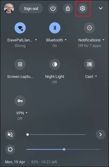 Якщо ви ще не включена підсистема Chrome OS Linux, вам необхідно включити його. Це займе всього кілька кліків. Клацніть область повідомлень (трей), щоб відкрити меню налаштувань і натисніть на значок зубчастого.