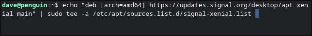 echo "deb [arch = amd64] https://updates.signal.org/desktop/apt Xenial Main" | sudo tee -a /etc/apt/sources.list.d/signal-xenial.list