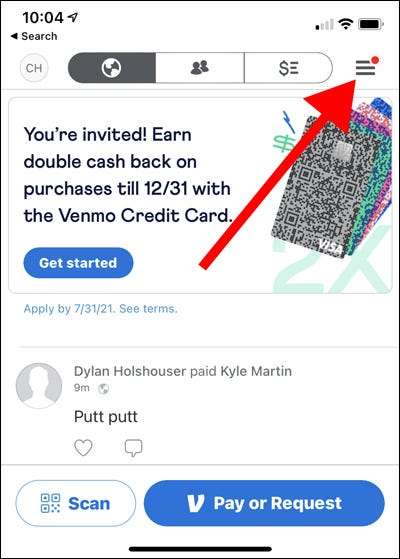 Відкрийте додаток Venmo і голову на головному екрані. Натисніть на значок меню у верхньому правому куті.