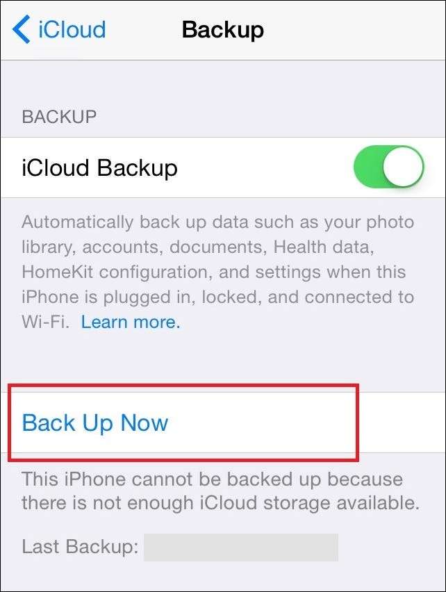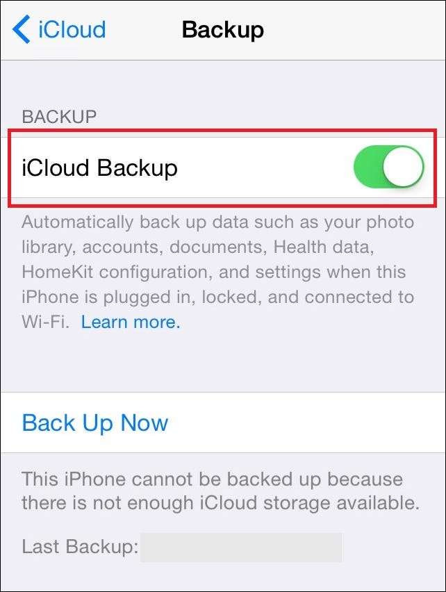 Це меню містить як перемикач, який визначає, чи буде ваш iPhone робити резервну копію до облікового запису iCloud, а також можливість вручну запускати резервну копію на той момент.