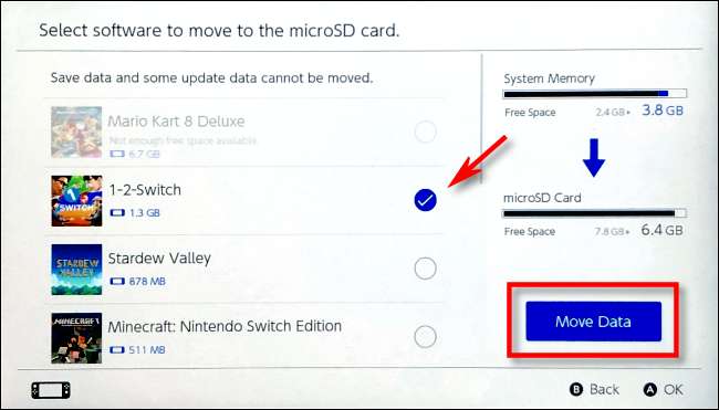 Вам буде представлений список ігор, що зберігаються в системній пам’яті, які можна перемістити на карту microSD. Прокрутіть список і виберіть гру (або ігри), яку ви хочете перемістити, за допомогою синіх прапорців біля них. Ви можете переміщати більше однієї гри одночасно, якщо на карті microSD вистачає вільного місця.