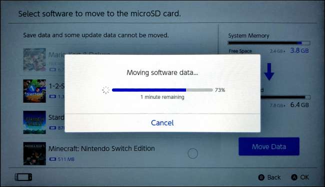 Завдяки комутатору системного програмного забезпечення версії 10.0.0 або пізнішої, Nintendo дозволяє переміщувати програмне забезпечення з внутрішньої системної пам'яті на картка microSD вставлений у комутатор (і навпаки). Цей метод працює лише для ігор, завантажених із Інтернет-магазину Nintendo. Програмне забезпечення, що зберігається на Ігрові карти не можна перемістити в пам'ять microSD.