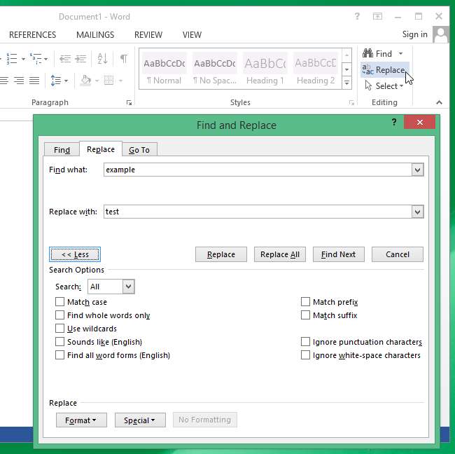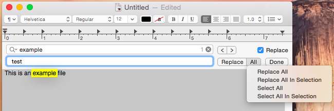 Ви також можете натиснути та утримувати кнопку Усі, щоб отримати доступ до додаткових параметрів - наприклад, ви можете вибрати курсор курсором розділу текстового документа та запустити операцію пошуку та заміни лише на цьому виділеному тексті.