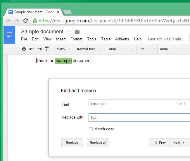 Ви також можете зробити це в Документи Google . Якщо ви ще не використовуєте Документи Google, перейдіть до Веб-сайт Google Drive і створити новий документ. Якщо потрібно, скопіюйте та вставте текст у новий документ і скористайтеся опцією меню «Редагувати> Знайти та замінити», щоб виконати пошук та заміну.