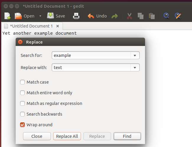 Наприклад. у текстовому редакторі Gedit, включеному до Unity Ubuntu, MATE та Cinnamon Linux Mint та інших робочих столах на базі GNOME, вам просто потрібно натиснути меню пошуку та вибрати Замінити, щоб розпочати.