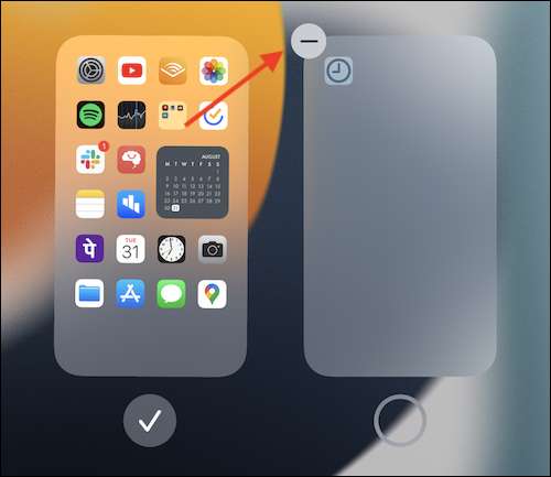 Тепер ви побачите всі сторінки домашнього екрана, викладені. По-перше, торкніться кнопки "Галочка" нижче сторінки, яку ви хочете видалити. Це приховує сторінку.