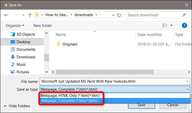 Виберіть папку для збереження сторінки, а потім у спадному меню виберіть «Веб-сторінка, лише HTML» або «Веб-сторінка, завершена». Перший зберігає лише вміст, життєво важливий для подальшого доступу до нього (текст та форматування), а другий зберігає все (текст, зображення та додаткові файли ресурсів). Якщо ви хочете мати доступ до цілої сторінки в автономному режимі, виберіть опцію “завершити”.
