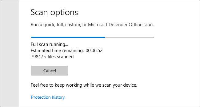 Якщо ви раніше не пробували Defender або якщо ваш комп’ютер працює смішно, і вас турбує очевидна загроза, найкраще розпочати з Повного сканування. Виберіть перемикач біля пункту «Повне сканування» та натисніть кнопку «Сканувати зараз».