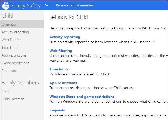 Якщо ви налаштовуєте комп’ютер для дітей молодшого віку, ви можете також налаштувати батьківський контроль. Windows 8 має вбудований батьківський контроль , відомий як Сімейна безпека. Ця функція дозволяє фільтрувати веб-сайти, обмежувати час роботи комп’ютера, обмежувати доступ до певних програм та ігор та переглядати інформацію про використання комп’ютера. Ви можете переглянути та налаштувати всі ці деталі Веб-сайт Microsoft Family Safety , навіть коли ви перебуваєте далеко від комп’ютера.