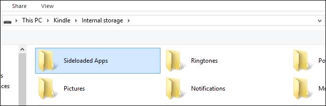Далі нам потрібно створити папку в корені внутрішньої пам’яті Kindle. Ми можемо зробити це, запустивши ES File Explorer і натиснувши кнопку «Створити» внизу, щоб створити нову папку, або встановивши Kindle на наші комп’ютери за допомогою кабелю синхронізації USB і створивши папку разом із провідником файлів нашої операційної системи. У будь-якому випадку, вам слід створити папку / Sideloaded Apps / в кореневій системі, приблизно так: