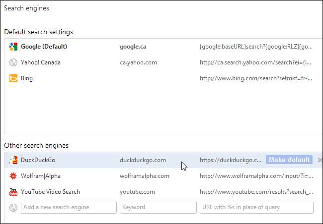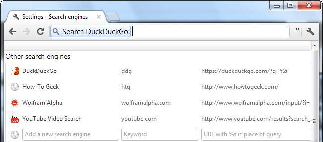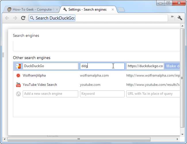 Важливі варіанти виділено жирним шрифтом. Тут ми призначили ключове слово ddg до пошукової системи за адресою http://duckduckgo.com/?q=%s . Змініть ці два рядки на потрібне ключове слово та URL-адресу пошукової системи.