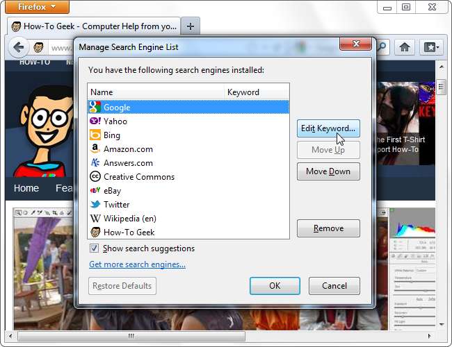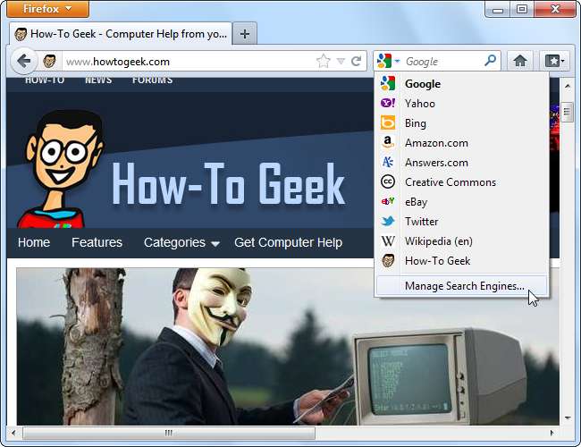 Firefox не включає жодних попередньо визначених ключових слів для пошуку. Щоб призначити ключове слово для пошуку, відкрийте спадне меню вікна пошуку та виберіть Керувати пошуковими системами.