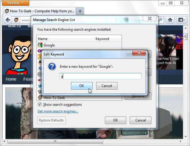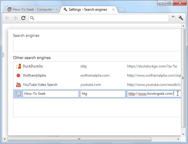 Створіть нову пошукову систему за допомогою вікна Додати нову пошукову систему. Однак замість того, щоб вказувати спеціальну URL-адресу, у якій є% s, просто введіть адресу веб-сторінки. Тут ми призначаємо ключове слово htg до How-To Geek.
