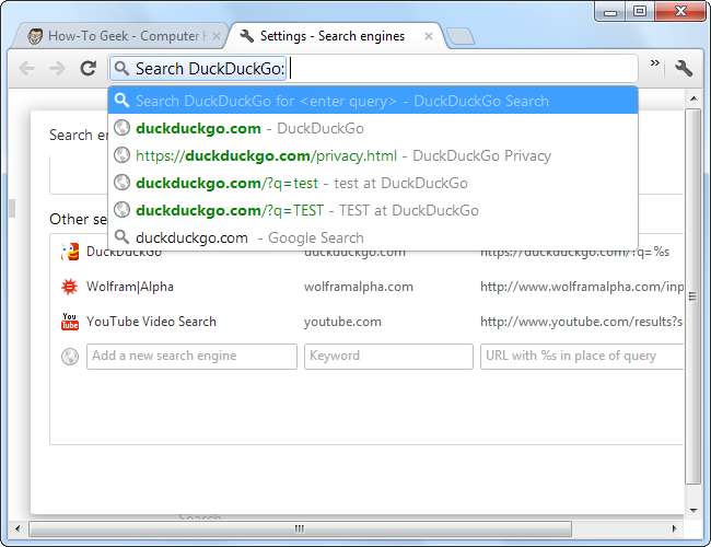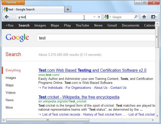 Призначивши ключове слово для пошуку, ви можете швидко здійснити пошук у цій пошуковій системі з адресного рядка. Наприклад, якщо ми призначили ключове слово g в Google, ми могли ввести g тест в адресному рядку, щоб швидко шукати в Google слово "тест".
