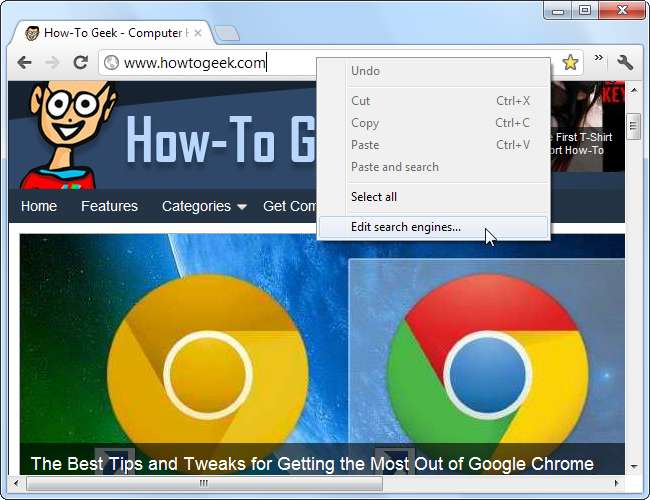 Щоб призначити ключове слово для пошуку в Chrome, клацніть правою кнопкою миші на панелі розташування Chrome і виберіть Редагувати пошукові системи.