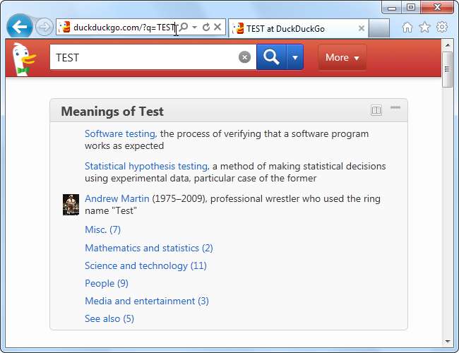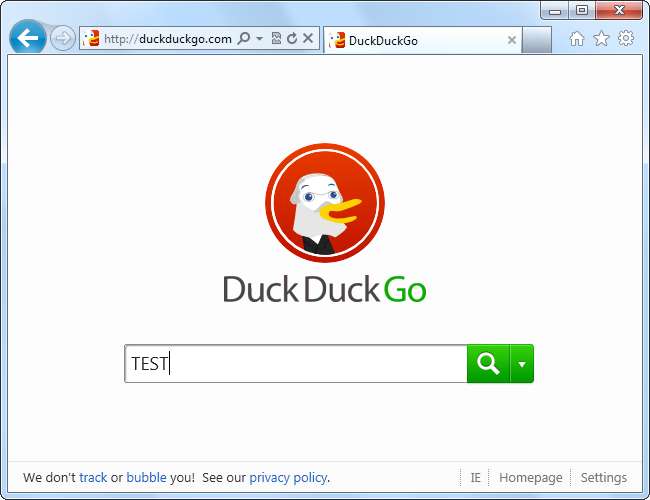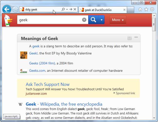 Після додавання файлу .reg ключове слово відразу стане доступним в Internet Explorer. Наприклад, ми могли ввести текст ddg гік в адресному рядку та натисніть Enter, щоб здійснити пошук “geek” на DuckDuckGo.