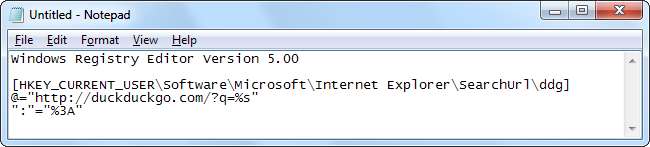 Тепер ми маємо всю необхідну інформацію. Запустіть Блокнот або інший текстовий редактор і введіть наступний текст, щоб додати DuckDuckGo: