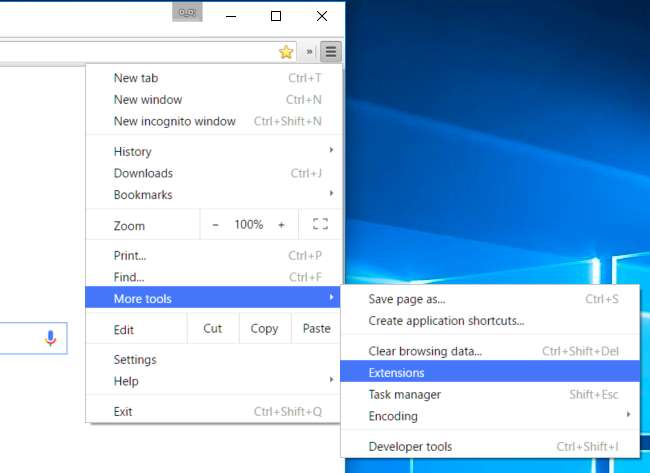 Google Chrome (та інші веб-браузери на базі Chromium) роблять це досить простим. У Chrome натисніть кнопку меню у верхньому правому куті вікна, наведіть вказівник на пункт «Інші інструменти» та виберіть «Розширення».