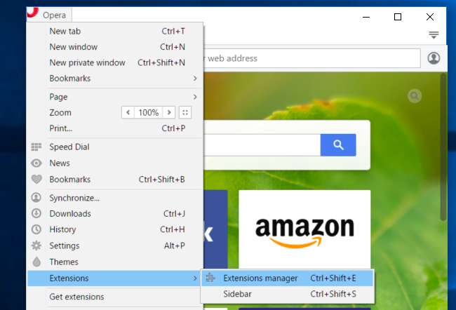 В Opera натисніть кнопку меню «Opera» у верхньому лівому куті вікна браузера, наведіть курсор на «Розширення» та виберіть «Менеджер розширень», щоб переглянути список встановлених розширень.