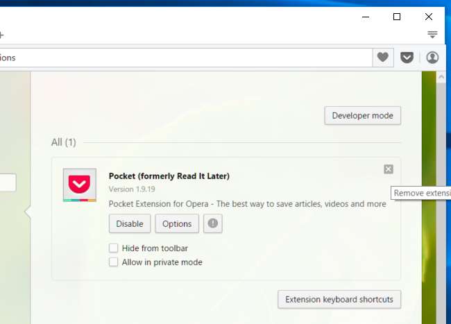 Натисніть кнопку «х» праворуч від розширення, щоб видалити його, або натисніть кнопку «Вимкнути» під розширенням, щоб вимкнути його, не видаляючи з браузера. Вам не доведеться перезапускати Opera після вимкнення або видалення розширення.