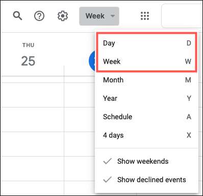 Відкрити Календар Google настільний веб-сайт і вхід в Google рахунки ви хочете використовувати , якщо необхідно. Виберіть або «День» або «Тиждень» вид зі списку у верхній частині.