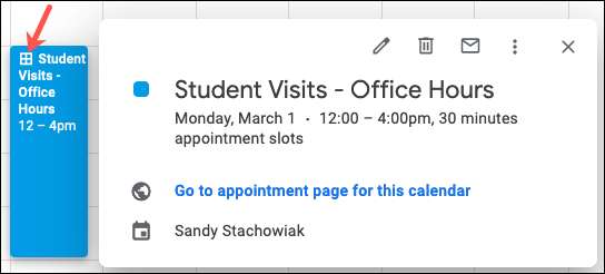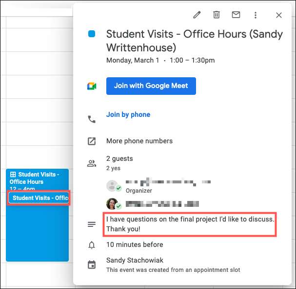 Натисніть, що конкретну подію, щоб переглянути будь-яку інформацію, яку людина включена, коли вони зберегли слот. Ви також можете змінити його з великою кількістю деталей, як з будь-яким іншим подією Календаря Google.