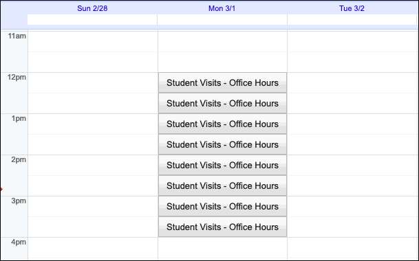 Якщо ви хочете, щоб блокувати час в календарі, щоб зробити себе доступним для інших користувачів, розглянути можливість використання призначення слотів в Google Calendar. Тоді поділіться посиланням на сторінку призначення для інших, щоб зарезервувати ті часи, щоб зустрітися з вами.