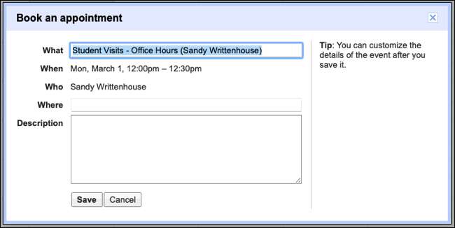 Вони можуть просто натисніть на слот, вони хочуть, щоб резерв з вами, при бажанні додайте опис і натисніть «Зберегти». Це дозволить додати подію до свого календаря Google.