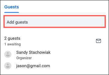 Щоб додати гість, двічі клацніть блок призначення в календарі Google, щоб відкрити сторінку з детальною інформацією. З правого боку, введіть його ім'я (якщо вони знаходяться в ваших контактах Google) або адресу електронної пошти в поле «Додати гість».