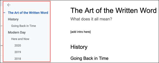 Контур документа в Документах Google не тільки для показу - це інтерактивна. Якщо ви натиснете назву або заголовок, ви будете брати безпосередньо до цього місця у своєму документі. Це дивовижно при роботі з довгими звітами, оскільки це працює так само, як Зміст у Документах Google .