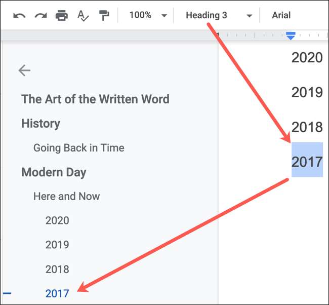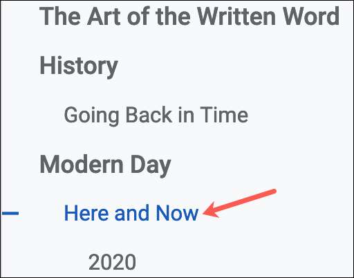 Крім того, контур документа може допомогти вам відстежувати, де ви знаходитесь у вашому файлі. Коли ваш курсор знаходиться під заголовком у вашому документі, цей заголовок відображатиметься у синьому шрифті, який передує тире в контурі. Це зручно, коли ви працюєте над документом, який містить багато вмісту або зображень між заголовками.