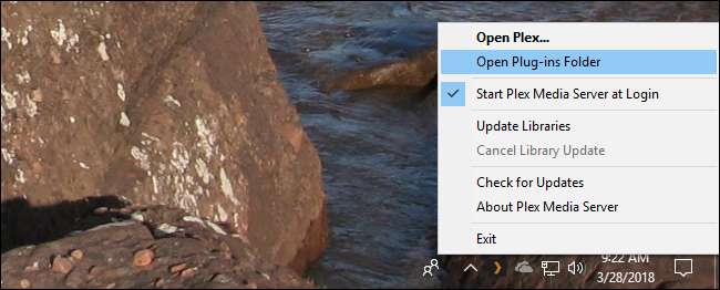 . Тепер перетягніть цю папку до каталогу плагінів Plex, який можна знайти в Windows, клацнувши правою кнопкою миші значок лотка сервера Plex, а потім клацнувши команду «Відкрити папку плагінів».