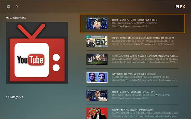 Розділ "Переглянути пізніше" простий у використанні, але він не дозволяє вам робити такі речі, як перегляд підписок на YouTube, коли ви сидите перед телевізором із запущеним клієнтом Plex. На щастя, є YouTube TV для Plex , плагін, який дозволяє вам переглядати і дивіться відео на YouTube.