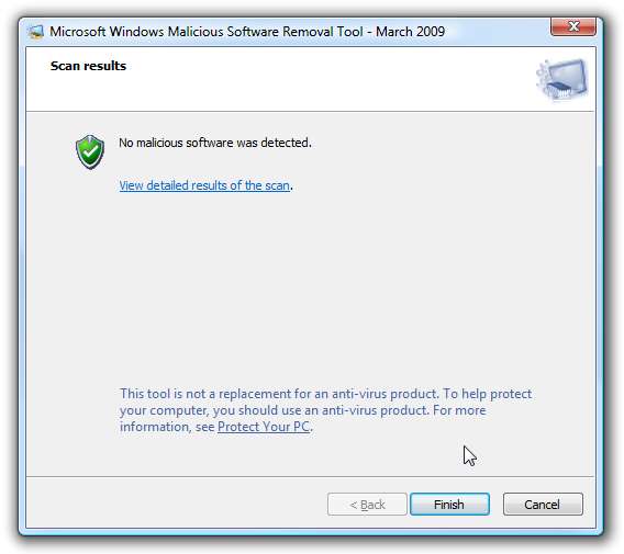 Якби ви постраждали, інструмент видалив вірус і попередив вас. Оскільки ми на щастя в безпеці, ми отримали дружнє повідомлення про те, що зловмисне програмне забезпечення не виявлено. Ви можете натиснути “Переглянути детальні результати сканування”, щоб побачити більше інформації.