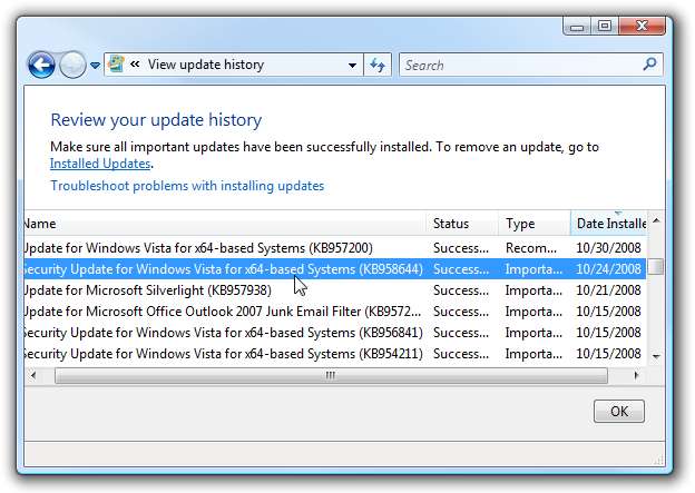 Це призведе до великого списку кожного встановленого оновлення. Перегляньте список, і ви побачите оновлення, згадане у бюлетені з безпеки ... для мене це було KB958644 для систем на базі x64, оскільки я працюю з 64-розрядною системою Vista.