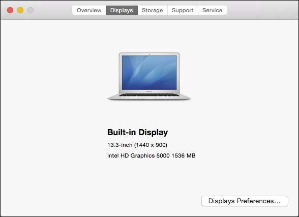 Клацніть на вкладку "Дисплеї", і вона повідомить вам розмір екрана, його роздільну здатність та графічне обладнання вашого Mac.