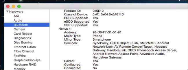 Ще однією цікавою категорією для перевірки є Bluetooth, яка надає детальну інформацію про пристрої, які були з'єднані з вашим Mac, включаючи те, що наразі підключено, які послуги вони надають тощо.