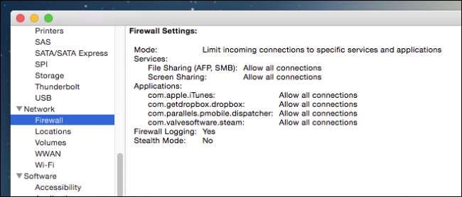 Так само розділ Мережа може розкрити цікаві факти про ваші зв’язки. Перевірте “Брандмауер”, щоб дізнатись, чи він увімкнений, активність ведення журналу та які програми дозволяють усі з’єднання.